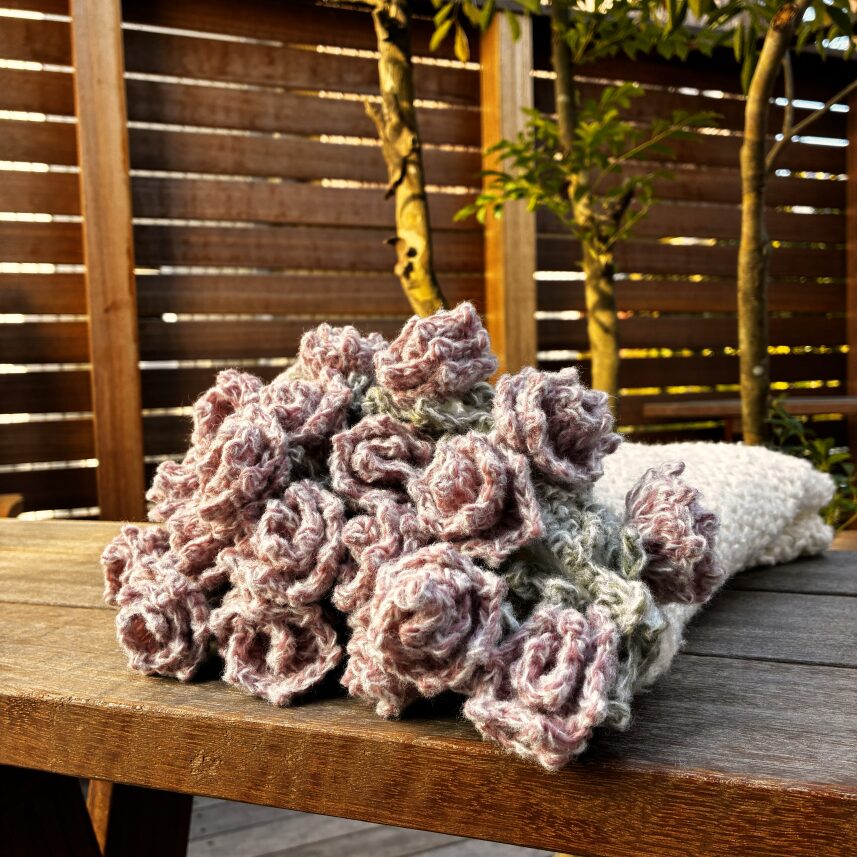 花束ブランケットはさっと持ち上げてふんわりと花束のようにまとめるのが楽しいので、家族で動画を撮ったりして存分に楽しめました。ソファに掛けておくだけでも華やかになり、編んでいる最中だけでなく、出来上がり後を楽しめる作品になったと思います。