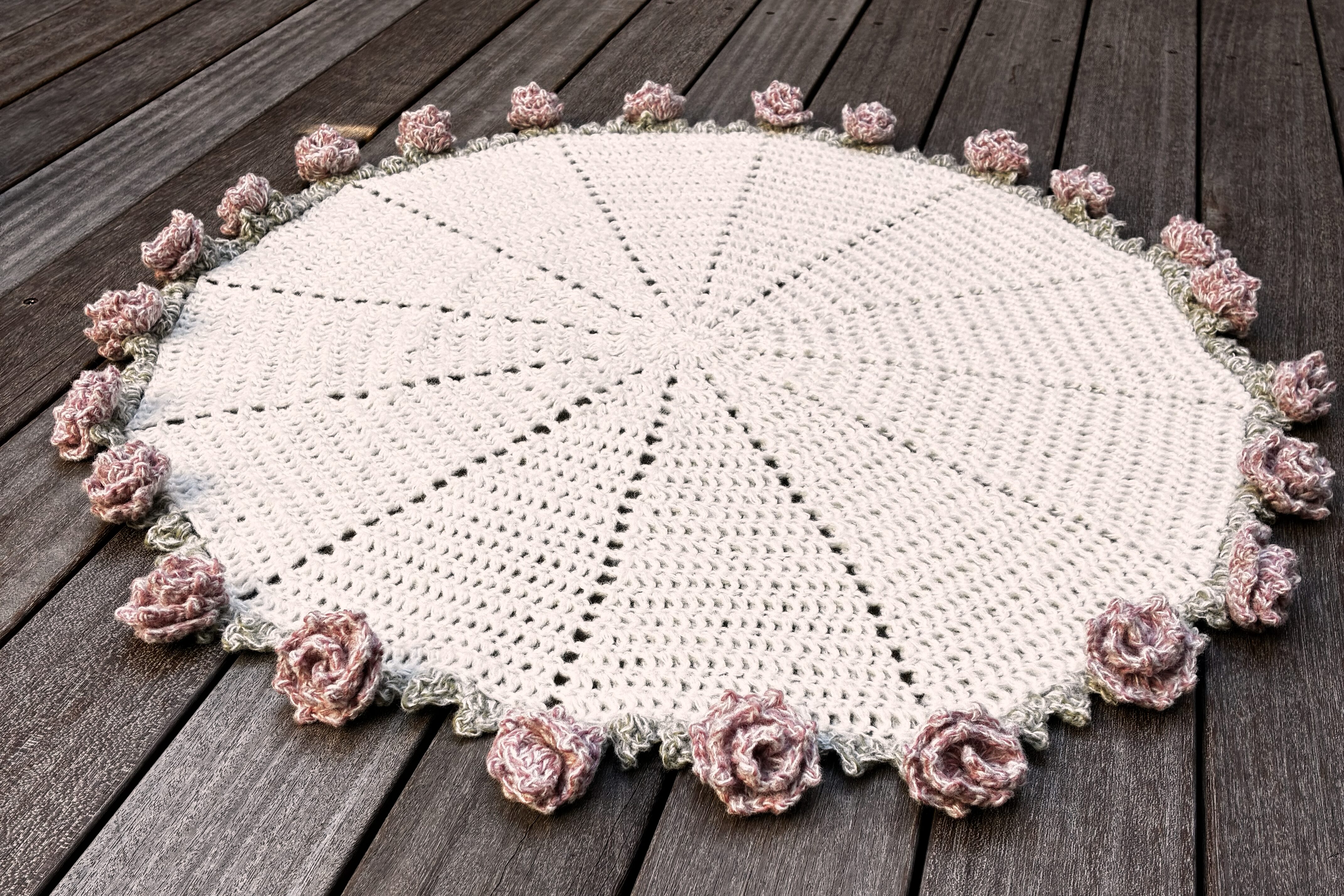 ただ、ブランケット部分が小さめなのでバラの花も小さくしたかったため、17目ではなく15目に修正して作成しました。最終的に24個作成しましたが、取り付けながらバランスを見て数を決めました。